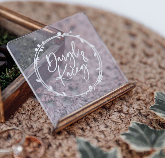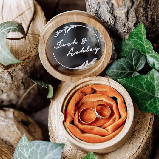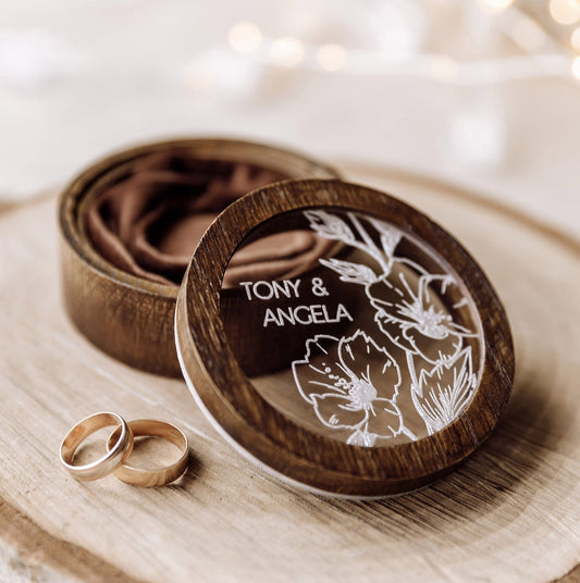 Personalized Wedding Ring Box: Round Wood & Acrylic, Custom Engraved ∙ Round BROWN