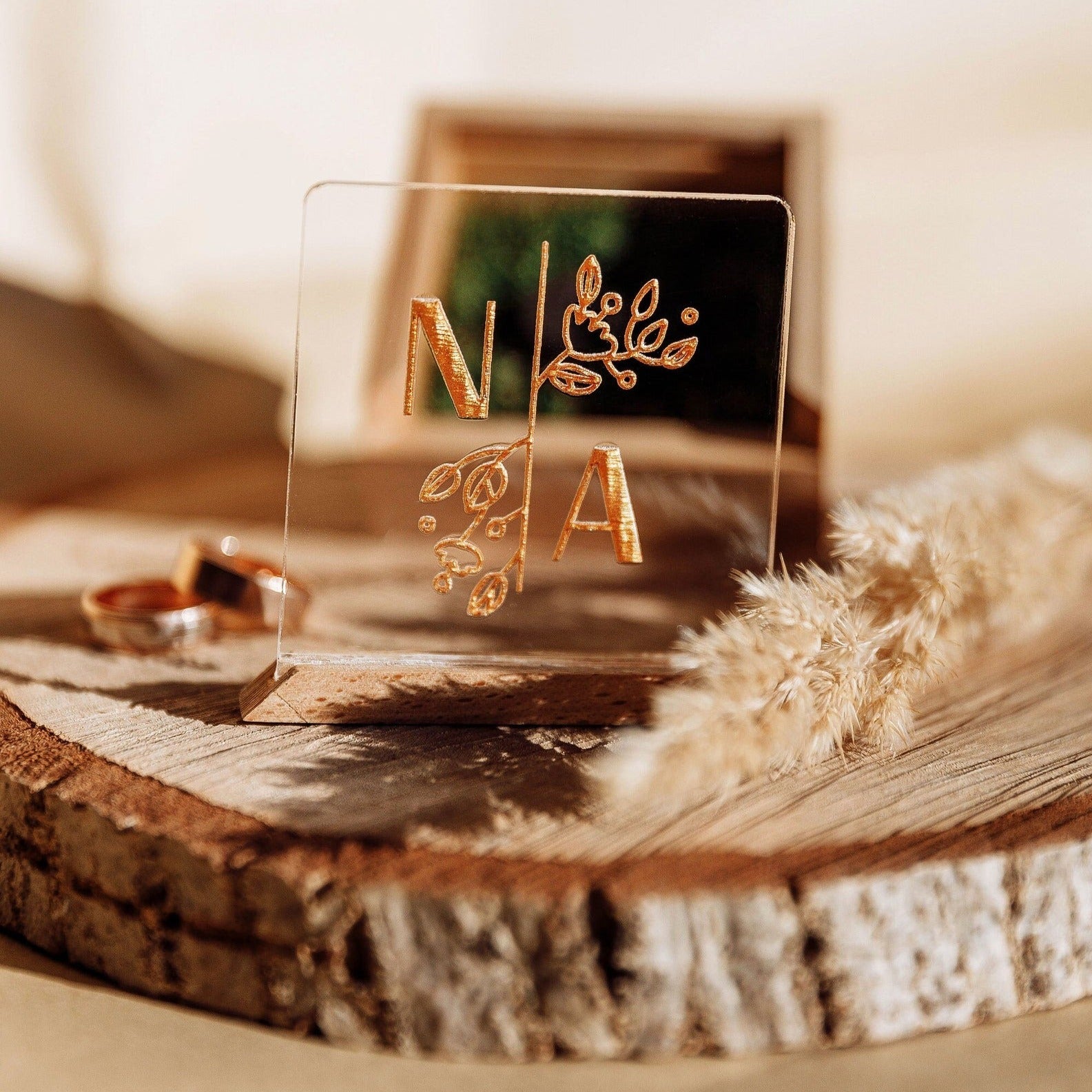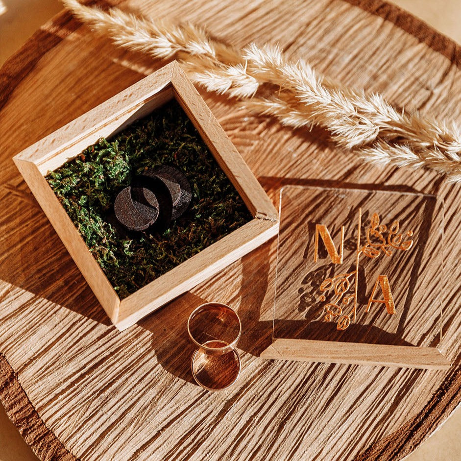 Всередині скриньки розміщений дерев'яний подіум для обручок. Він розроблений під МАЙЖЕ ВСІ МОЖЛИВІ РОЗМІРИ. Та щоб не сталося неприємного сюрпризу, і ваші колечка точно помістилися, наполегливо просимо перевірити розміри ваших обручок перед замовленням.