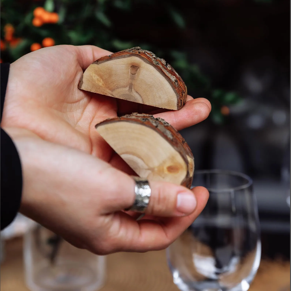 High-quality plywood finished with natural stain and varnish, mounted on a natural wood slice base. Because of the natural material, color and bark texture may vary — this adds to the charm